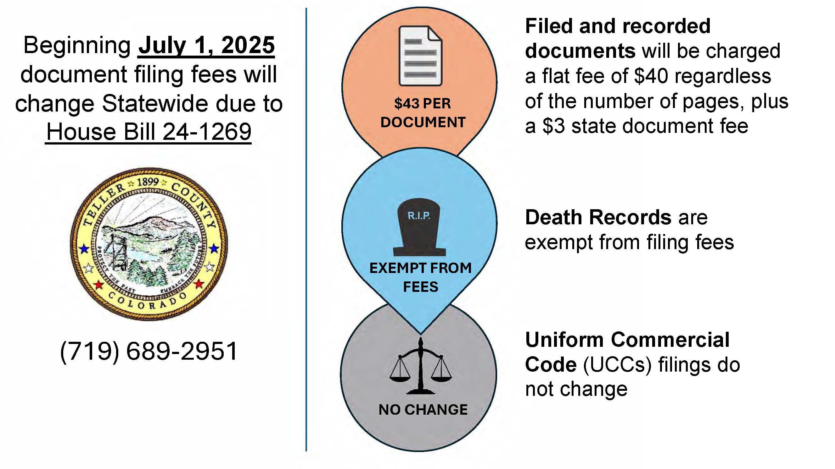 Beginning on July 1, 2025 document filing fees will change Statewide due to House Bill 24-1269.Filed and recorded documents will be charged $40 regardless of the number of pages, plus a $3 state document fee.Death Records are exempt from filing fees.Uniform Commercial Code (UCC's) filings do not change.For questions, contact Teller County Clerk and Recorder (719) 689-2951